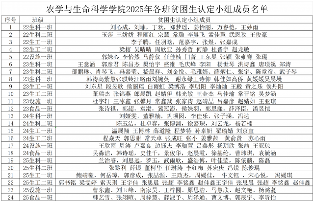 农学与生命科学学院2025年各班贫困生认定小组成员名单